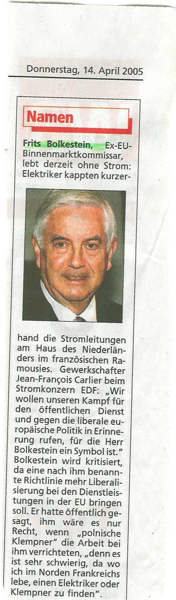 Französische Gewerkschafter der Elektrizitätswerke kappten dem Verantwortlichen für die EU-Richtlinie zur Liberalisierung des Dienstleistungssektors die Stromzufuhr --- Zeitungsausschnitt aus WAZ vom 14.04.05